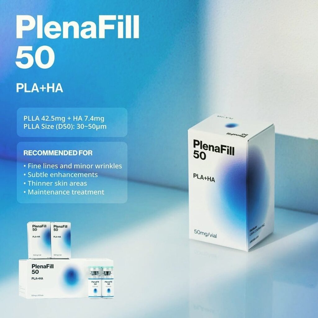 PlenaFill 50 is a collagen-stimulating injectable combining 42.5mg of polylactic acid with hyaluronic acid. It’s designed for delicate facial areas to improve firmness, restore volume, and support long-term skin regeneration